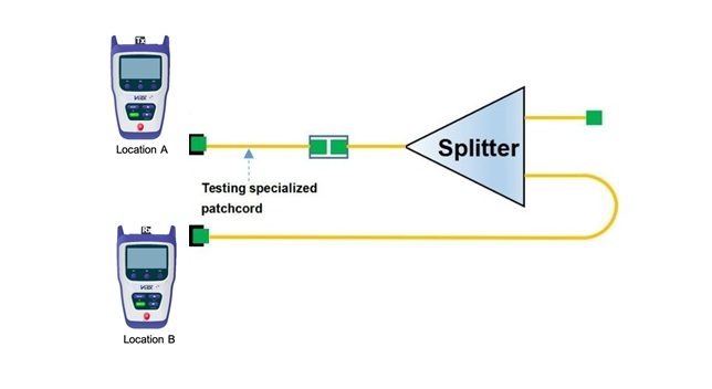 Bây giờ, chúng ta đo kiểm suy hao bộ chia quang 1×2 đơn giản nhất như hình ảnh hiển thị bên trên. Đầu tiên, gắn cáp tham chiếu khởi động vào nguồn sáng quang (Tx – Location A) có bước sóng thích hợp (một số bộ chia phụ thuộc vào bước sóng), sau đó hiệu chuẩn đầu ra của cáp tham chiếu khởi động bằng đồng hồ đo công suất quang (Rx – Location B) để đặt tham chiếu 0dB. Gắn nguồn sáng khởi động vào bộ chia và gắn cáp tham chiếu khởi động thu vào đầu ra và đồng hồ đo công suất quang, sau đó đo độ suy hao.
